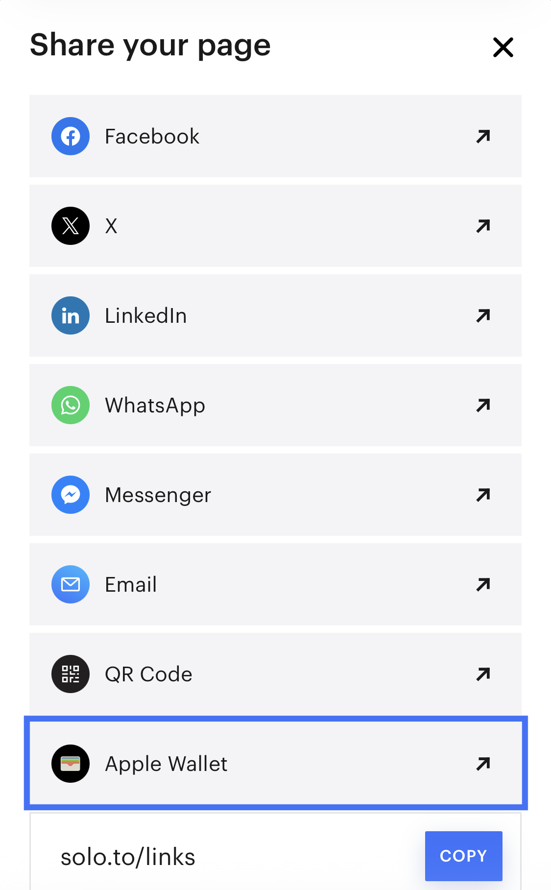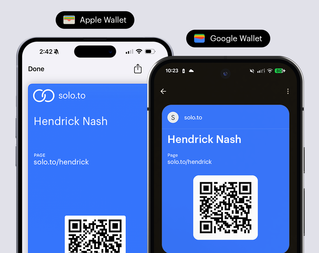 You can save your page link as a wallet pass in Apple or Google Wallet for easy in-person sharing between mobile devices.